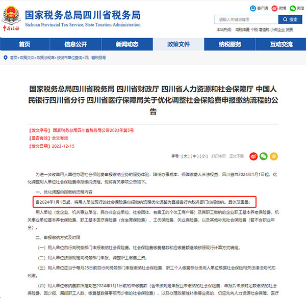 12月15日,国家税务总局四川省税务局、四川财政厅、四川省人力资源和社会保障厅、中国人民银行四川省分行、四川省医疗保障局联合发布《国家税务总局四川省税务局 四川省财政厅 四川省人力资源和社会保障厅 中国人民银行四川省分行 四川省医疗保障局关于优化调整社会保险费申报缴纳流程的公告》。自2024年1月1日起,将用人单位现行的社会保险费申报缴纳流程优化调整为直接自行向税务部门申报缴纳。不必在多部门间“来回跑”。